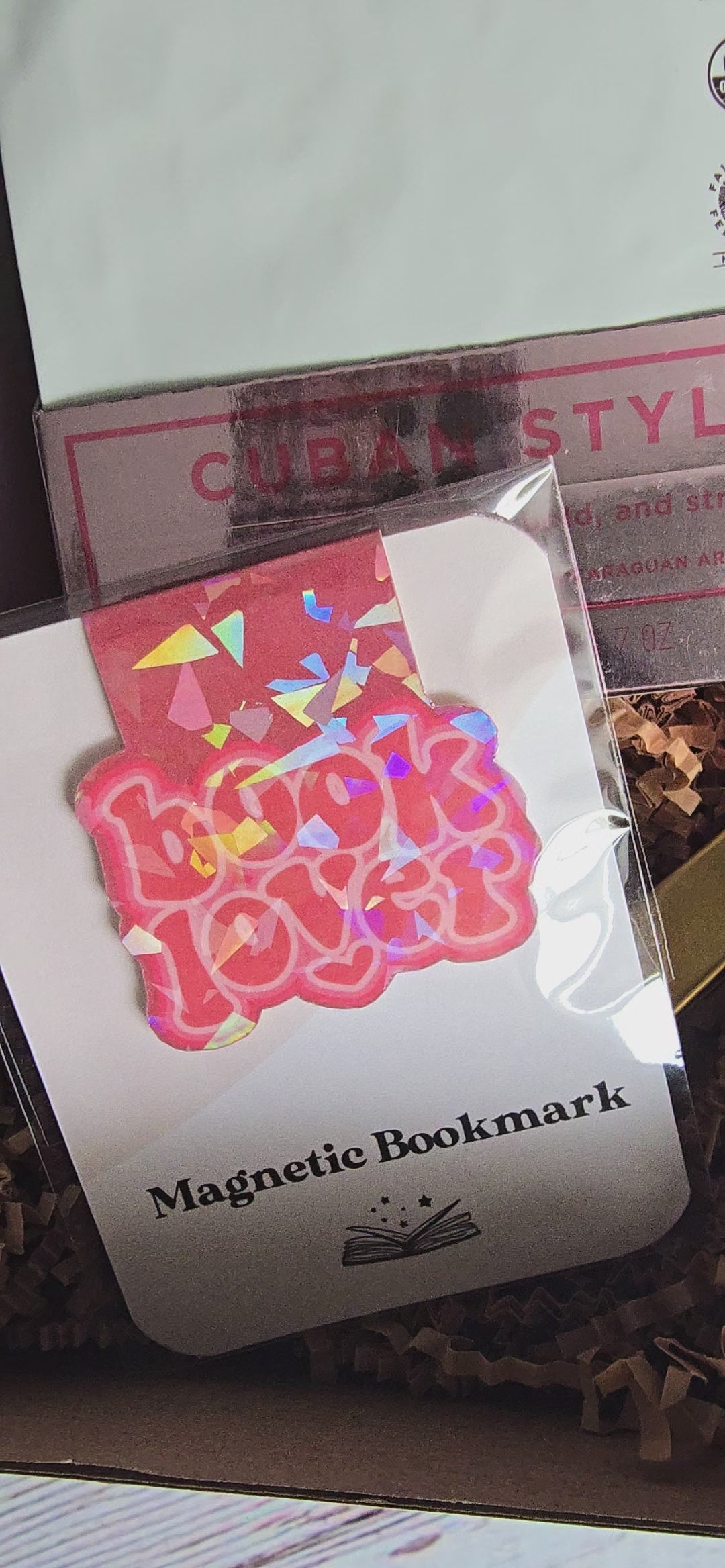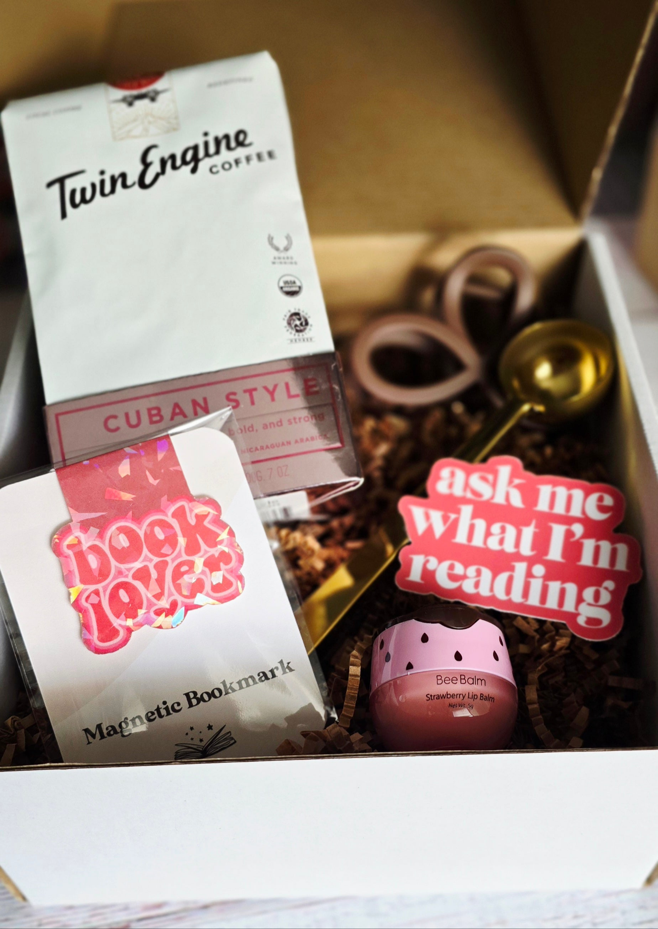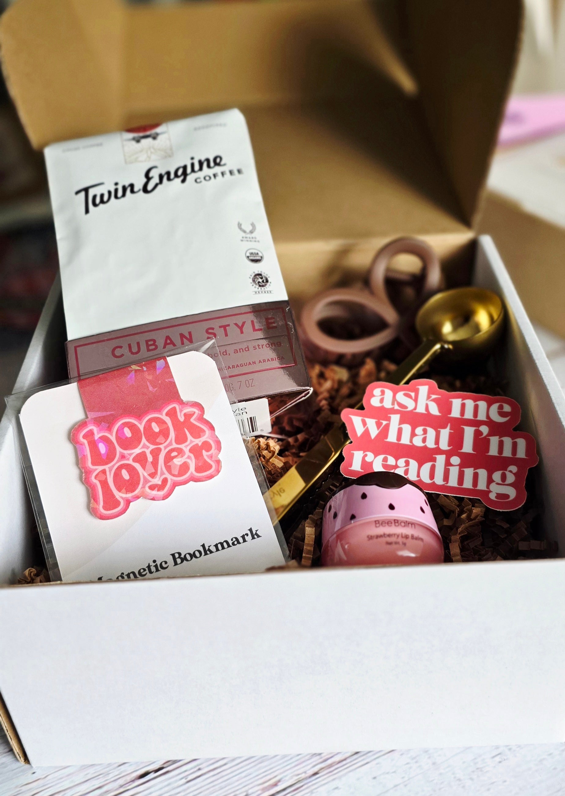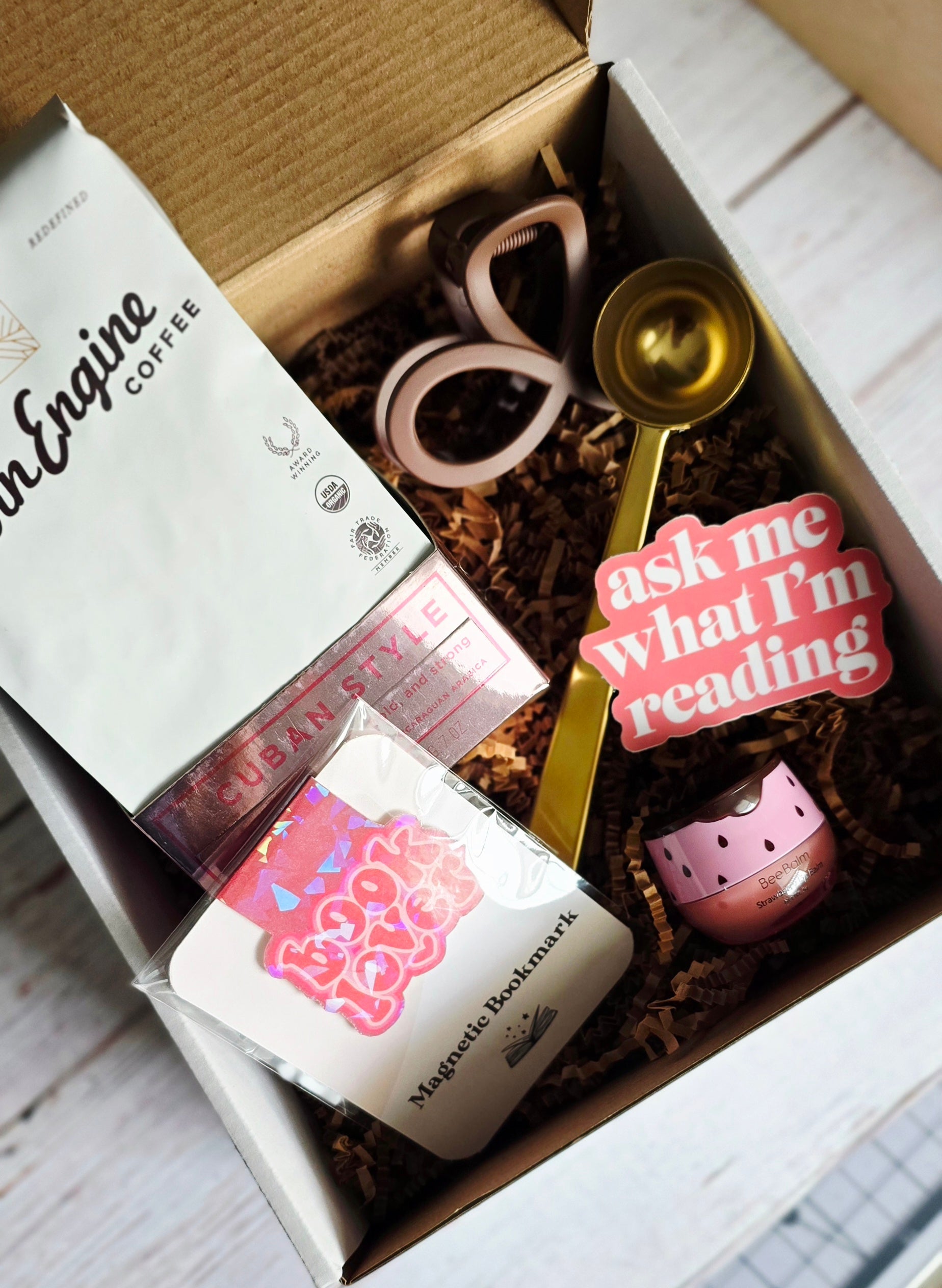Bold Cuban whole bean coffee, magnetic bookmark, lip balm, golden coffee scoop (doubles as a bag clip), and self-care extras to complete the ritual