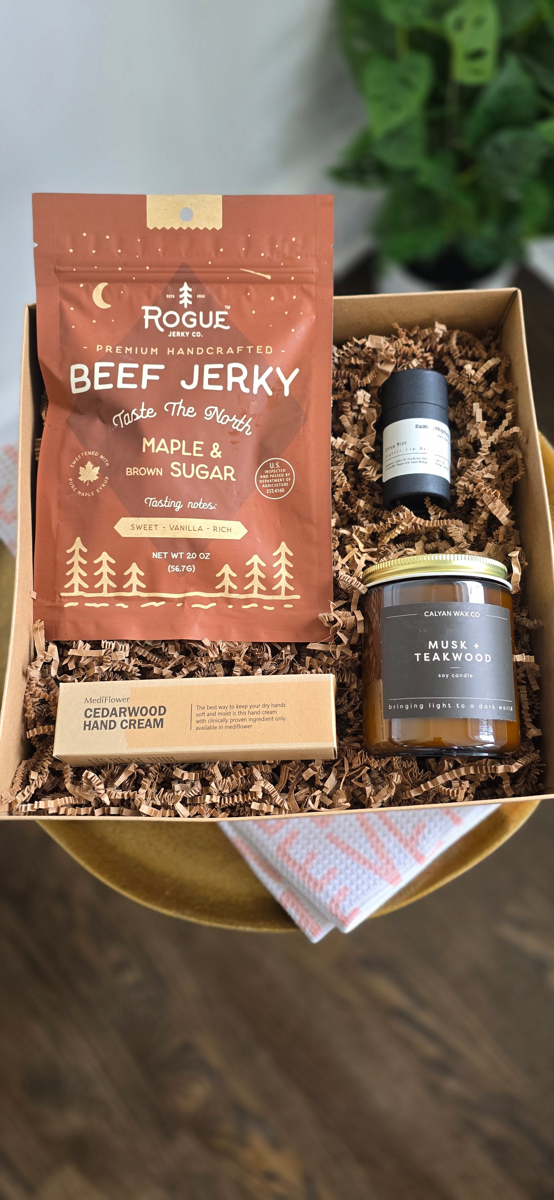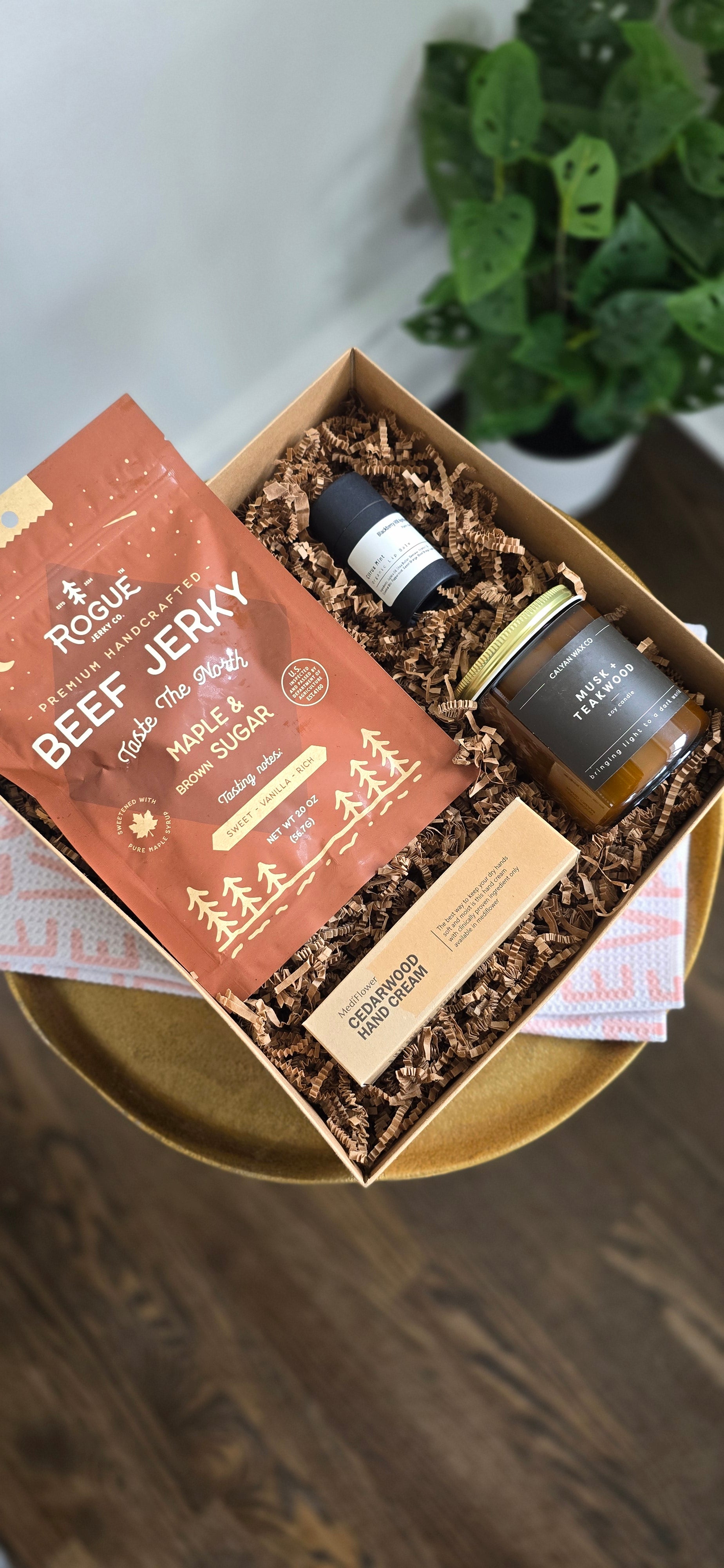 Fireside is a refined men’s gift box designed for moments of quiet luxury. Featuring maple & brown sugar beef jerky, a musk + teakwood candle, cedarwood hand cream, and a citrus mint lip balm from Blackberry Hill Apothecary, each piece is chosen for quality, comfort, and understated sophistication.