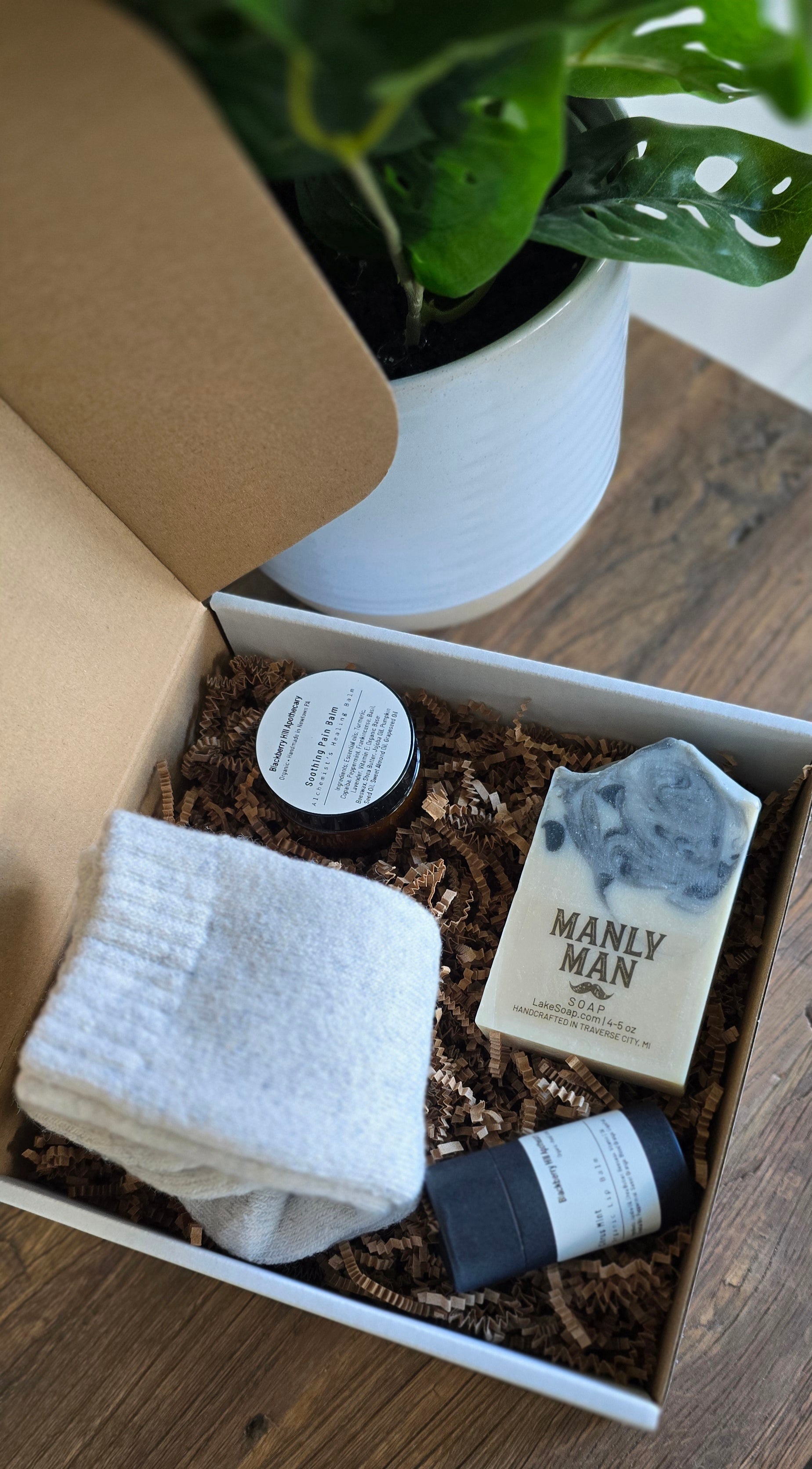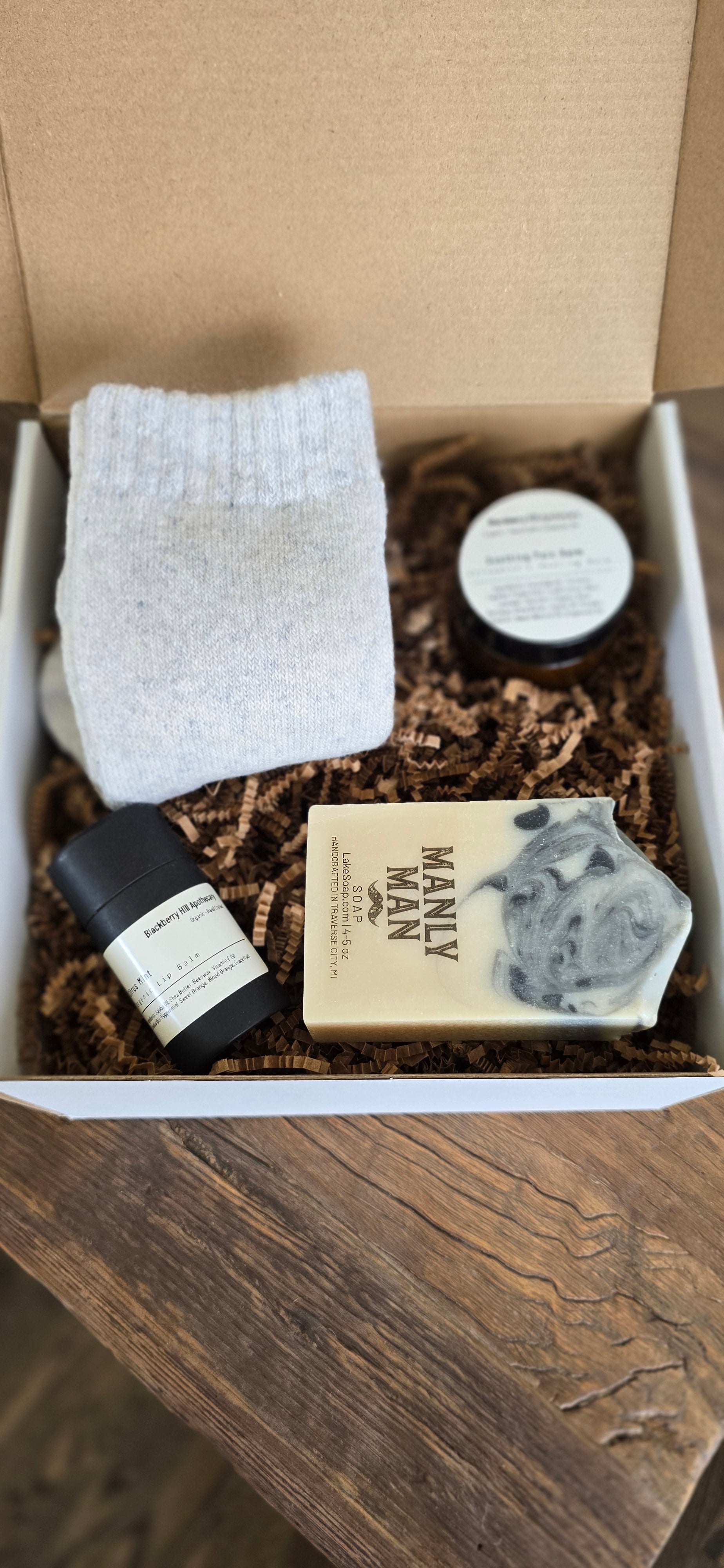 This box includes a handcrafted Manly Man soap with a clean, masculine scent, a Citrus Mint organic lip balm for everyday nourishment, a soothing pain balm formulated to help ease sore muscles and aches, and cozy wool socks designed for comfort and warmth.